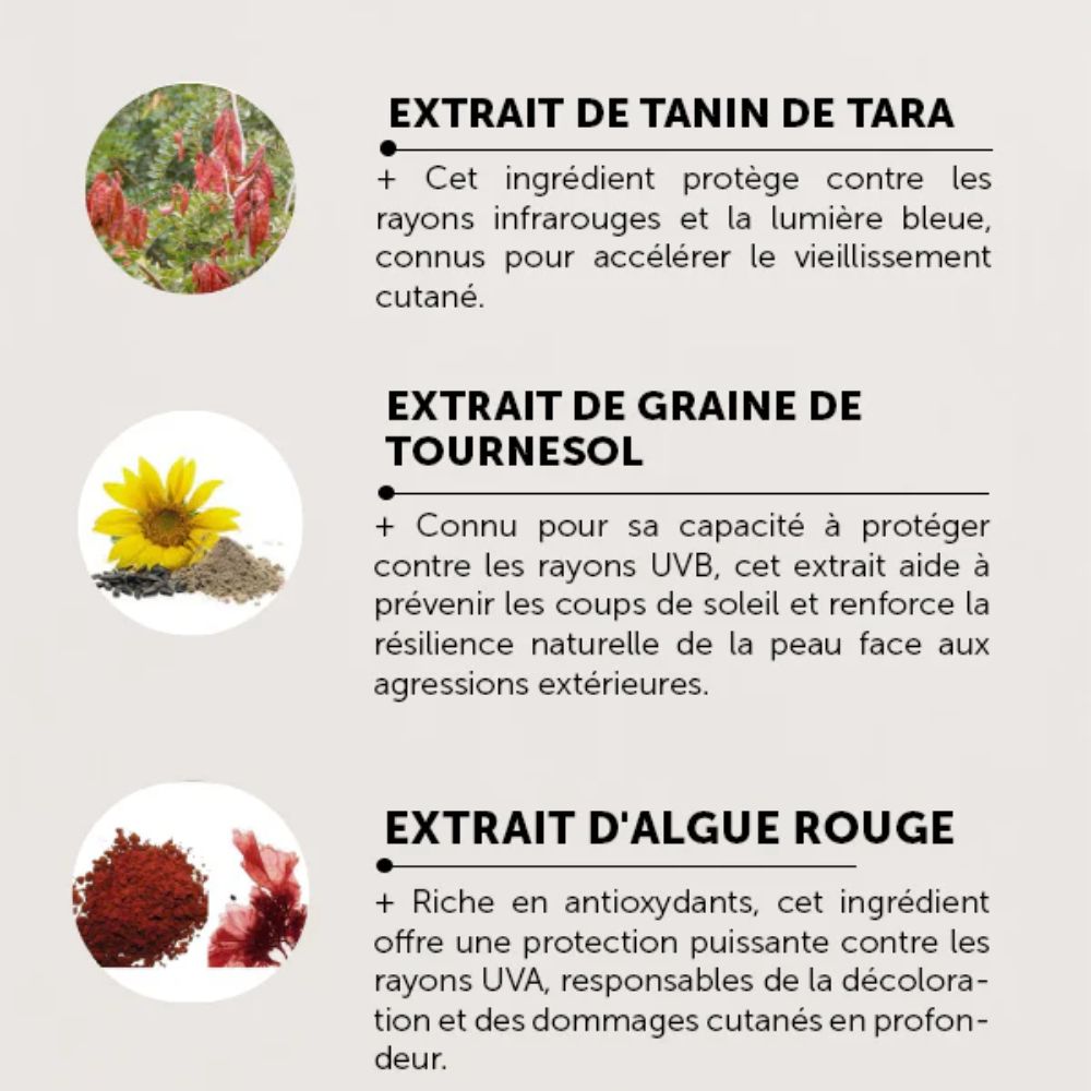 Known for its ability to protect against UVB rays, this extract helps prevent sunburn and strengthens the skin’s natural resilience against external aggressions.