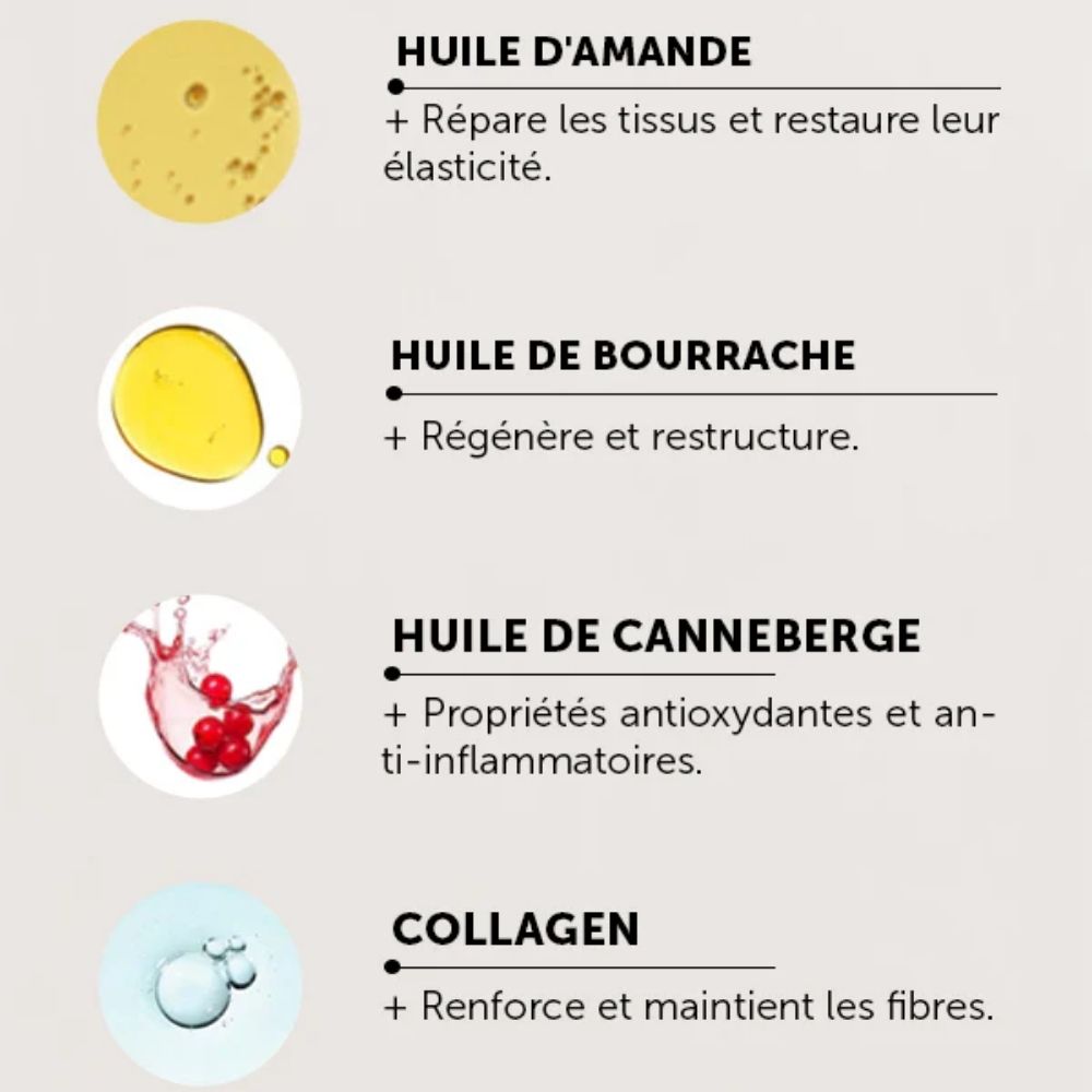 Collagène : Améliore le maintien et la résistance des fibres de la peau.