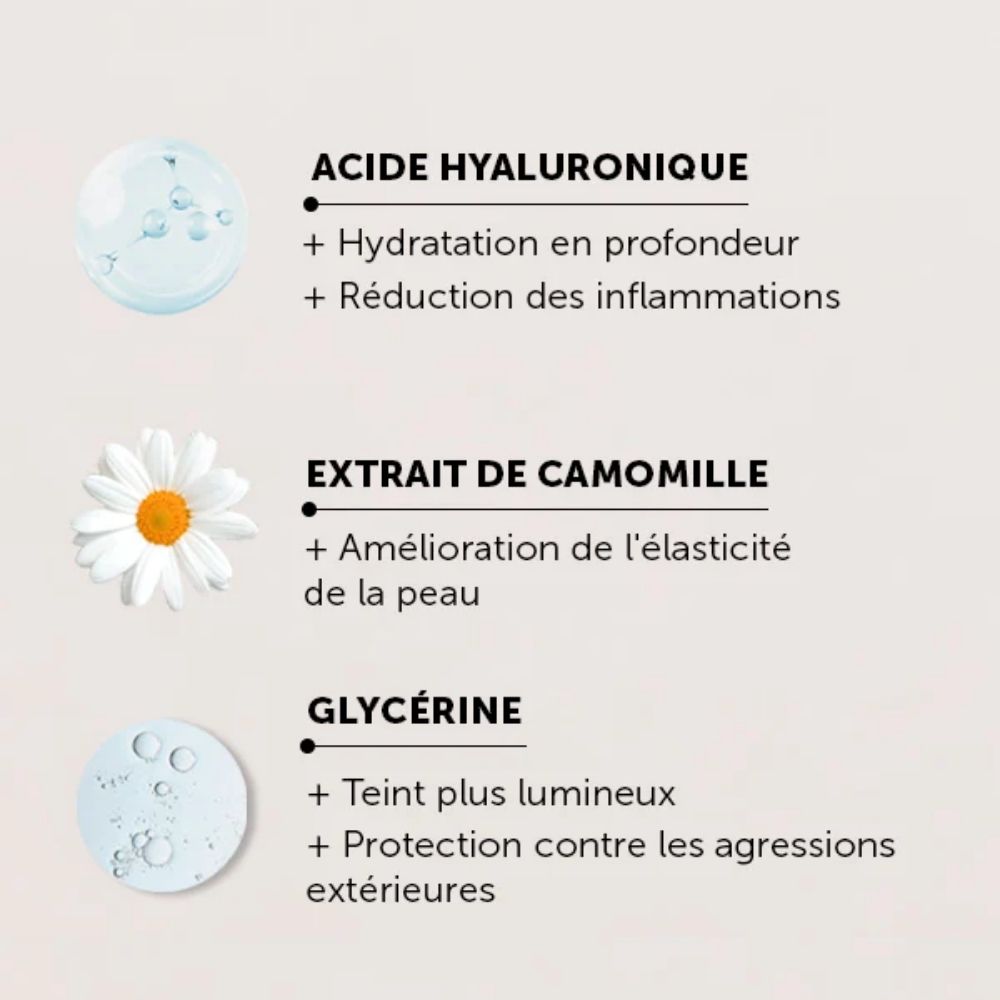 Une sérum hydratante délicate qui apaise, adoucit et rééquilibre la peau tout en la préparant à recevoir les soins suivants.