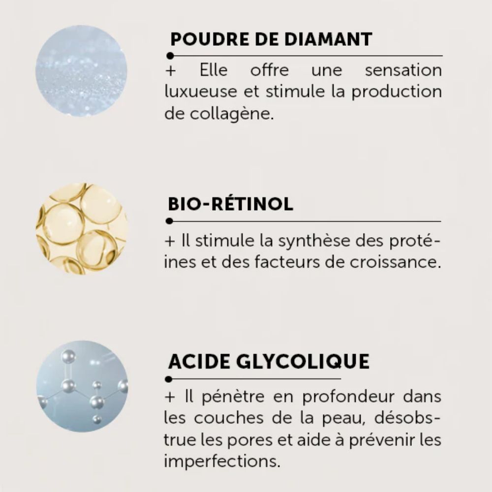 Poudre de diamant : Offre une sensation de luxe et stimule la production de collagène. Lisse le grain de peau et rehausse l’éclat.