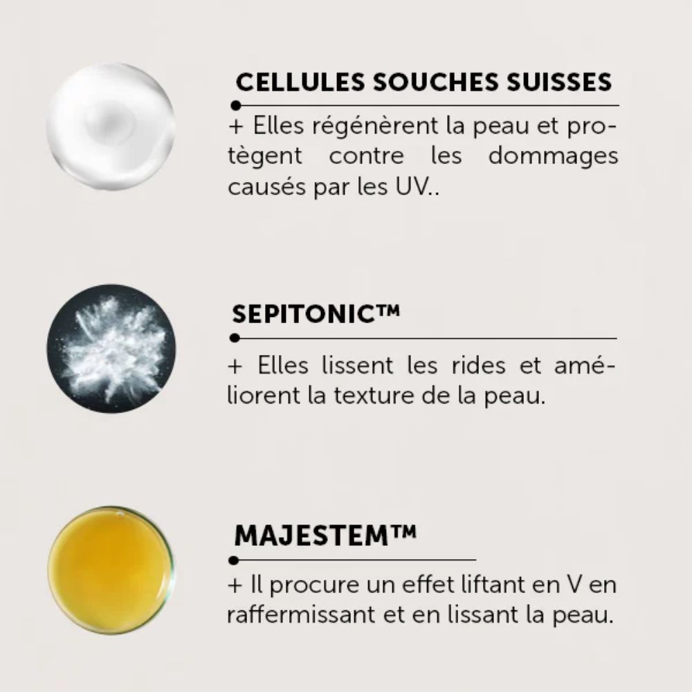 Cellules souches : Favorise la régénération de la peau et la protection contre les dommages causés par les UV.