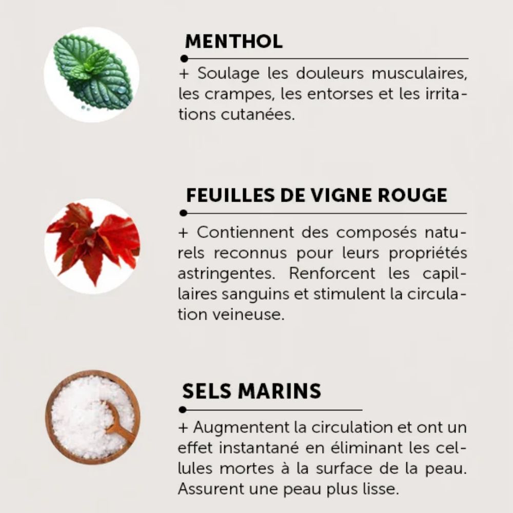 Sa formule associe des extraits végétaux reconnus pour leurs propriétés stimulantes sur la micro‑circulation, notamment le menthol, les feuilles de vigne rouge et les sels marins, qui agissent en synergie pour décongestionner, apaiser et revitaliser les jambes.